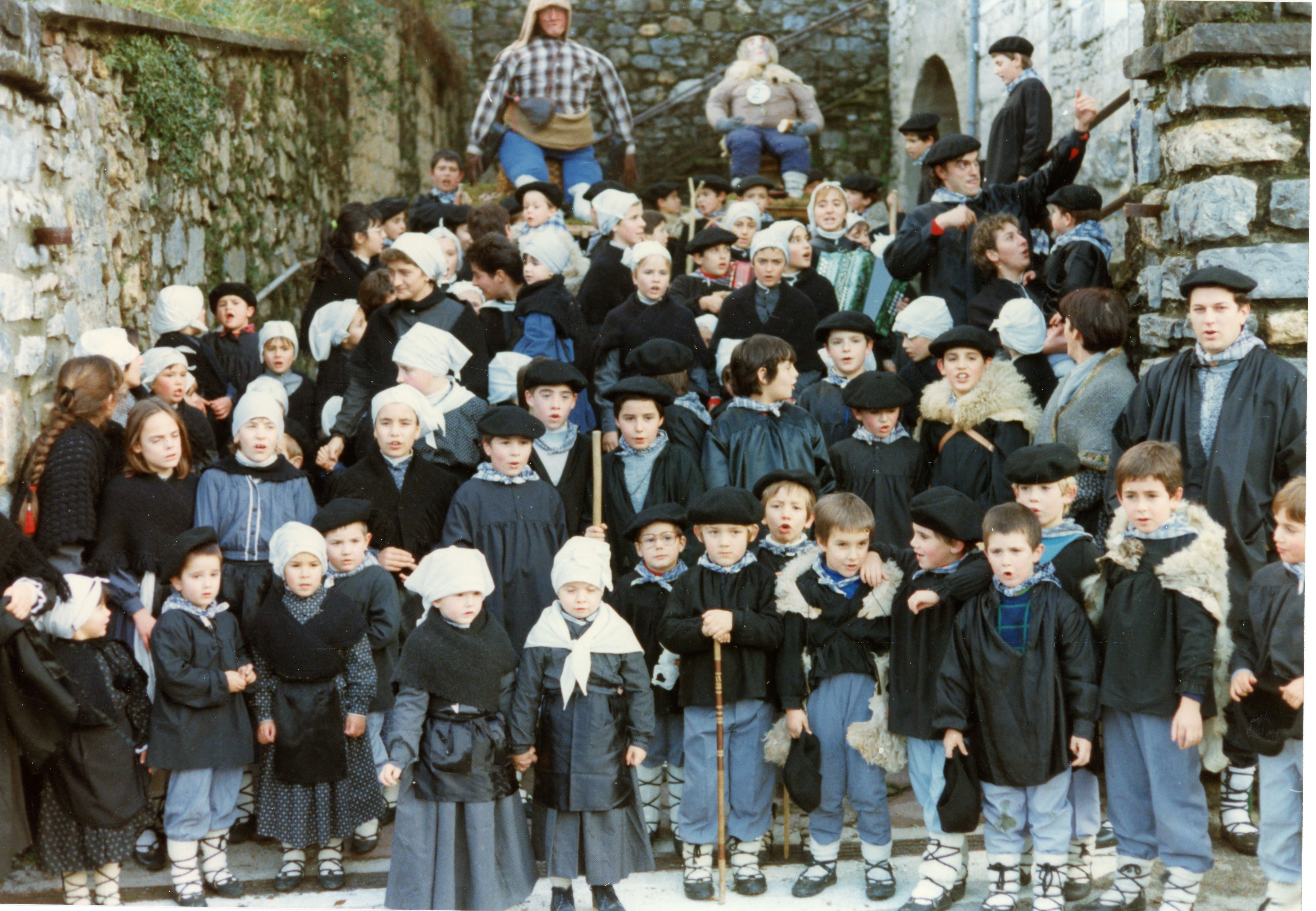 Ikastolako haurrak sarrera aurrean denak zutik kantuan. Atzekaldean trapuzko bi Olentzero daude aulki banatan eserita. 1986